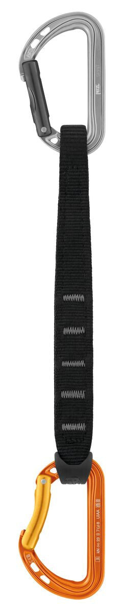 The benchmark for sport climbing and working routes! The SPIRIT EXPRESS quickdraw is lightweight, ergonomic, and versatile. The SPIRIT carabiners are designed to optimize use. The Keylock system helps prevent the carabiner from snagging when clipping and unclipping. Ergonomic, the EXPRESS quickdraw sling is the perfect shape to grab with your hand. The excellent weight-to-performance ratio allows you to adventure on different types of terrain like single pitch, multi-pitch, alpine rock, and ice. It is available in three lengths (12, 17, and 25 cm) to adapt to different uses and better manage rope drag.